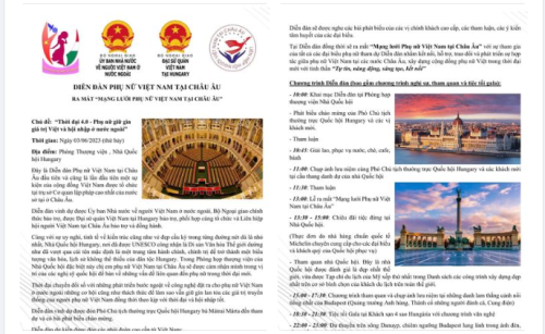 Chủ đề: “Thời đại 4.0 – Phụ nữ giữ gìn giá trị Việt và hội nhập ở nước ngoài” Thời gian: Ngày 03/06/2023 (thứ Bảy) Địa điểm: Phòng Thượng viện, Nhà Quốc hội Hungary Đây là Diễn đàn Phụ nữ Việt Nam tại Châu Âu đầu tiên và cũng là lần đầu tiên một sự kiện của cộng đồng Việt Nam được tổ chức tại trụ sở Cơ quan lập pháp cao nhất của nước sở tại ở Châu Âu. Diễn đàn do Hội Phụ nữ Việt Nam tại Hungary đăng cai tổ chức. Cùng với sự uy nghi, tinh